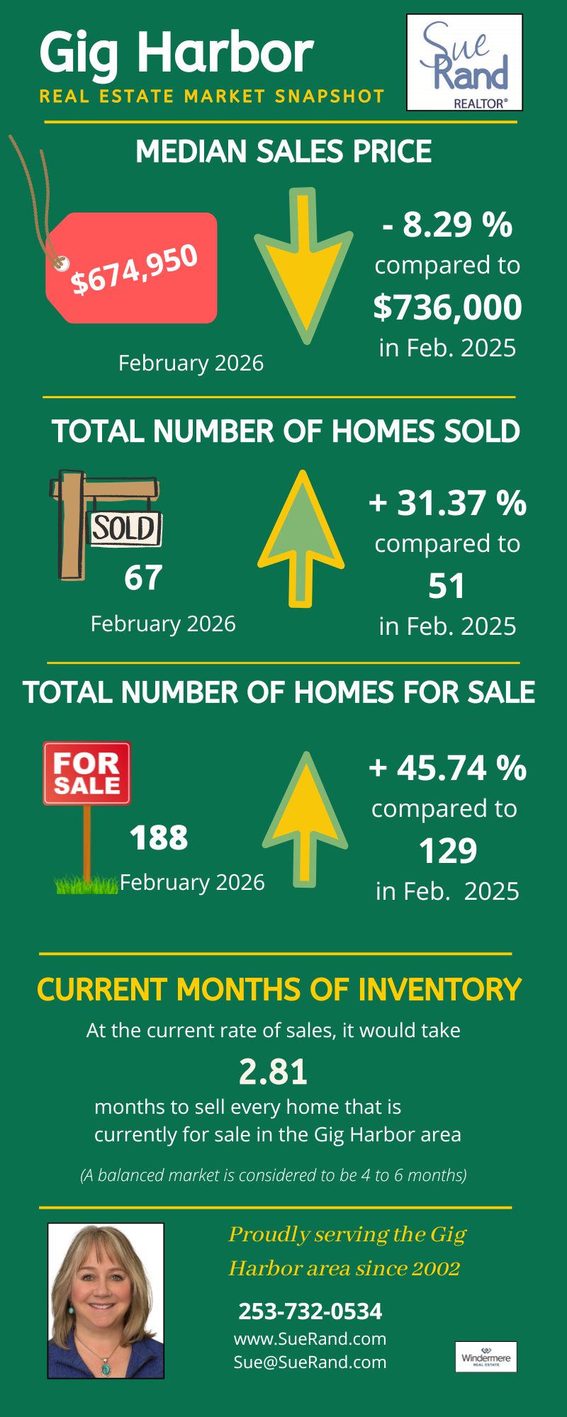 The first month of 2026 shows an increase in inventory from January of 2025, with median price and number of homes sold both down from last January. If you’re thinking about selling, it could be a good time for you. There’s a little less competition than we anticipate for the spring market. If you’re thinking about buying, take advantage of the lower prices while they last!
