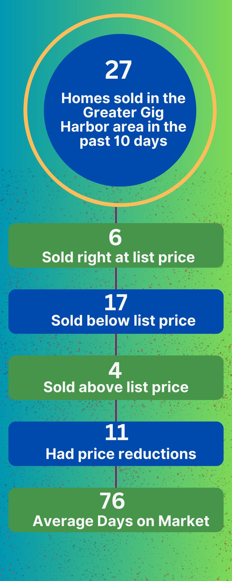 What isn’t obvious from this graphic is that days on market varied from a low of 6 to a high of 216. And it’s no surprise that the homes that took the longest to sell sold for less than asking price. Over-pricing is a huge deal, but usually very obvious within the first 10-14 days, so correcting early is a huge deal, too.